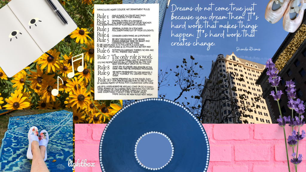 Here’s one of the boards I made. Looking back, it definitely speaks to my blend of the outdoor-art-picnic boho lifestyle with my love for bright colors and glitter. I guess that’s what happens when you’re a musical theatre girl, an indie songwriter, a modern dancer and a ballerina: one day I’ll be wearing jeans and a flowy blouse and Birkenstocks, and the next I’ll be in my bedazzled dance team jacket over my sparkly tutu. And through it all, I’ll be alternating the car tunes between Joni Mitchell and the “Wicked” soundtrack. See how much you can learn about a person from their inspiration? Now go have fun learning more about yourself!