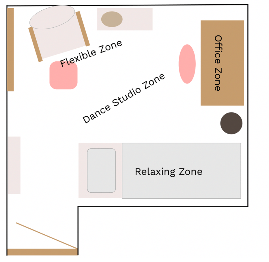 For example, my “work zone” with my desk, chair and trash can, faces toward the wall and away from my door to limit distractions. My “flexible zone,” on the other hand, faces toward the door and is near the window, so I can look out and be in close proximity to other activity around me. My “dance studio” zone has the best lighting so that everyone can see me when I’m teaching class, and the biggest floor space for maximum movement.