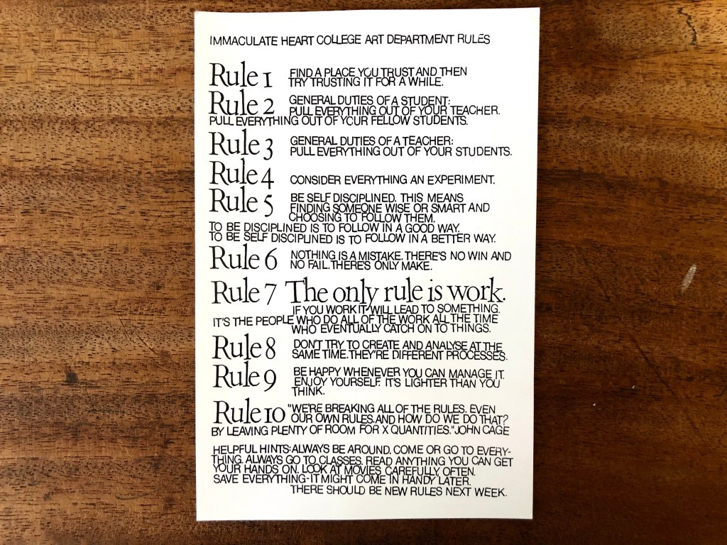 When we visited the center, I was struggling with feeling like my art wasn’t measuring up to those around me. But in one part of the office where there was a little store, I found this postcard, with Corita Kent’s ten rules for art.